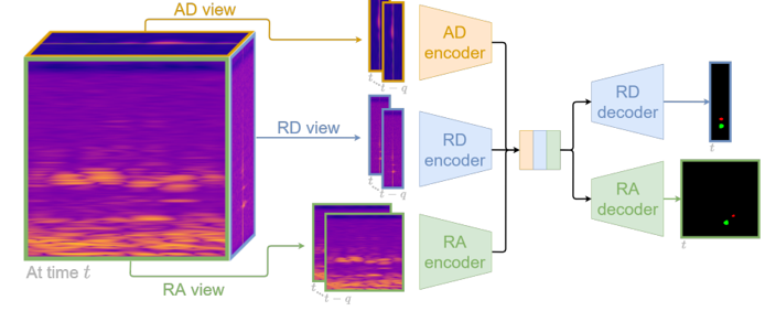 该系统任务由Valeo公司开发完成。前面所述的两种方法均基于RA视图进行数据处理,并以doppler作为特征维度进行分析。然而我们还可以采取其他策略,在RD视图下进行数据处理时将azimuth作为特征维度,在AD视图下则以range作为特征维度进行分析。通过不同视图分别对数据进行独立分析后再统一至RA或RD视图框架内完成后续处理工作。这正是multi-view学习的基本思路之一也是RAD处理中常用的一种实现方式
