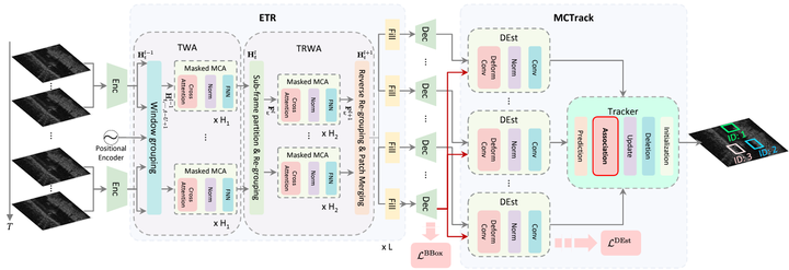 毫米波雷达在单帧数据中的噪声水平显著较高。因此,在实际应用中传统的方法都依赖于tracking技术以充分利用多帧信息资源。这一发现同样适用于基于深度学习的场景。在SIRA算法中,雷达点云被转换为网格数据的形式,并设计了两个关键模块来处理多帧网格数据:首先是通过交叉注意力机制构建的ETR模块能够有效提取多帧间的关联信息;其次是MCTrack模块则通过并行处理多帧数据来预测目标在当前帧的位置,并且这一过程能够帮助提升跟踪过程中的关联质量。