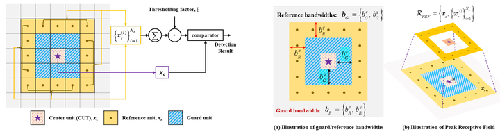 在提取局部极值的过程中,在目标点附近设置一个较小的排他区域(如图蓝色标注部分),并将其定义为"保护单元"。其原因在于,在极值点周围的潜在位置很可能也是实际存在的目标体而非背景噪声干扰。因此,在模拟CFAR过程中所采用的关键手段就是实现这一技术步骤。由此可见,在PeakConv的设计中,默认的感受野呈现空心正方形结构,在此结构中被特意移除的部分即为"保护单元"所在位置