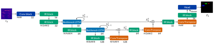 该工作同样源自NXP公司,在其研究中采用基于LSTM的多帧雷达数据处理方法来提取时序信息。研究中使用了RA视图来表示雷达数据,并且这种表示方法也可以扩展到多视图场景。整个网络架构采用了U-Net模式,在不同下采样阶段引入了LSTM机制以提取时序特征。