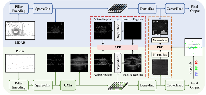 RadarDistill系统采用了基于PillarNet架构的设计方案其整体架构工作原理如图所示。其中激光雷达和毫米波雷达分支均采用了相同的网络结构毫米波雷达通过CMA模块对pillar特征进行预处理以提高其在知识蒸馏过程中的稠密化程度。随后系统分别对底层特征(AFD模块)与高层特征(PFD模块)实施知识蒸馏以实现跨模态信息的有效融合。