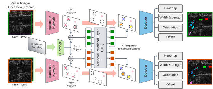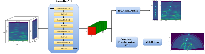 这项工作源自于加拿大滑铁卢大学以及Sensorcortek公司合作开发。该系统接收的数据格式为Range-Azimuth-Doppler(RAD)块,在这种格式中通过将range维与azimuth维作为空间维度,并将doppler维则被视为特征维度进行编码处理后即可实现将RAD信号直接映射成为二维图像形式的生成过程。在实际应用中这一方法已经被证明是最有效的经典方案之一,在其架构上采用了经典的ResNet模块构造方式进行设计,在此基础上经过深度学习模型处理后的特征图随后连接了两个基于YOLO的目标检测头:一个是基于range-arzimuth的空间信息头(Polar Head),另一个则是XY笛卡尔坐标系下的位置信息头(Cartesian Head)。