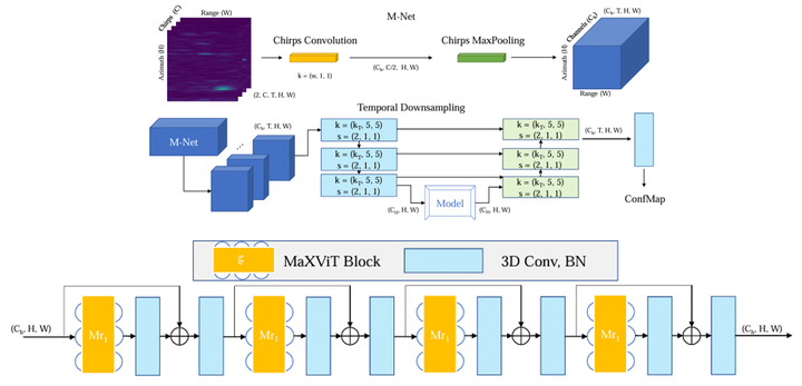 该工作起源于阿联酋穆罕默德·本·扎耶德人工智能大学,并划分为两大模块。其中一部分负责生成RA视图的特征图。与传统方法不同的是,在提取doppler维度特征时,并非使用常见的FFT算法而是采用了RODNet中的M-Net处理chirp维度。生成后,另一部分则采用了MaXViT这一改进型Vision Transformer架构来进行进一步特征提取。