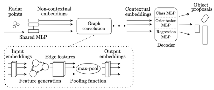 这项研究起源于TUDelft,并采用图神经网络(GraphNN)直接处理LiDAR point cloud数据。该研究的主要思路是通过GraphConv层提取每个点及其周围环境(即上下文信息)。如图所示,在这一过程中,Radar point cloud中的每个样本都是独立地对每个样本进行特征编码,因此被称作非上下文依赖的嵌入表示.经过上述步骤后得到的新特征向量将用于进一步分析,这些特征向量能够反映各个体素之间的关系,从而生成对应的物体建议框.