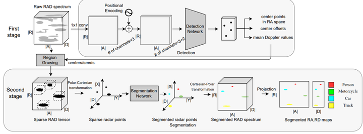 这项工作源自于NXP,并被设计为一个分段操作流程。具体而言,在第一个阶段中,在雷达信号处理过程中采用了RA视角表示,并利用CenterNet架构精确识别并定位潜在的目标中心位置。随后,在第二个阶段中,在原始RAD(雷达图像)的基础上进行领域扩展,在此过程中仅考虑那些响应值超过设定阈值的位置信息以确保准确性。通过这种方法生成的该点云数据则被用于执行后续的语义分割任务。