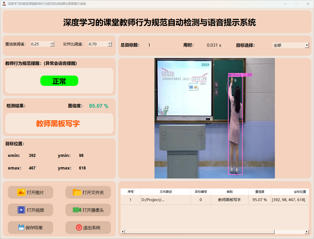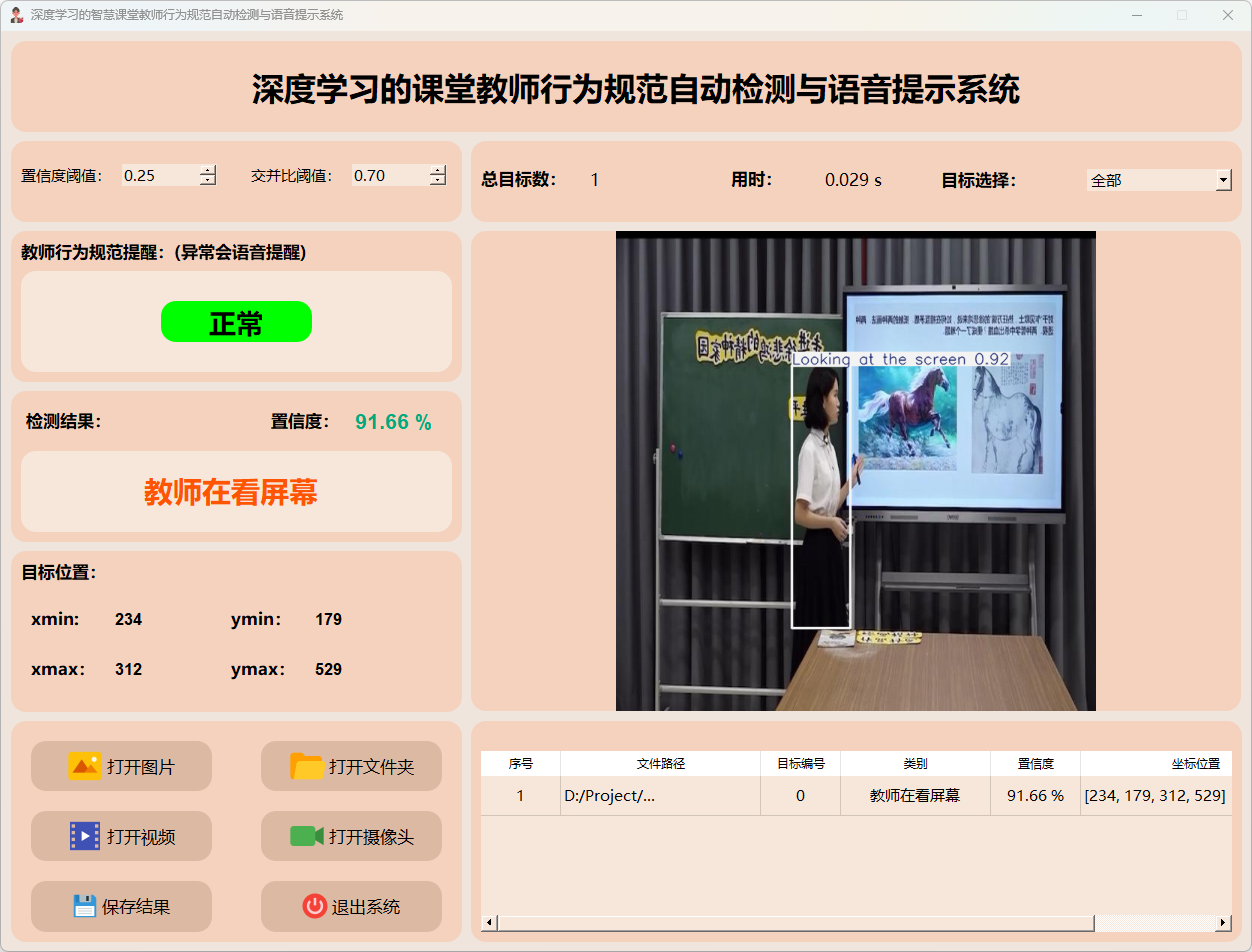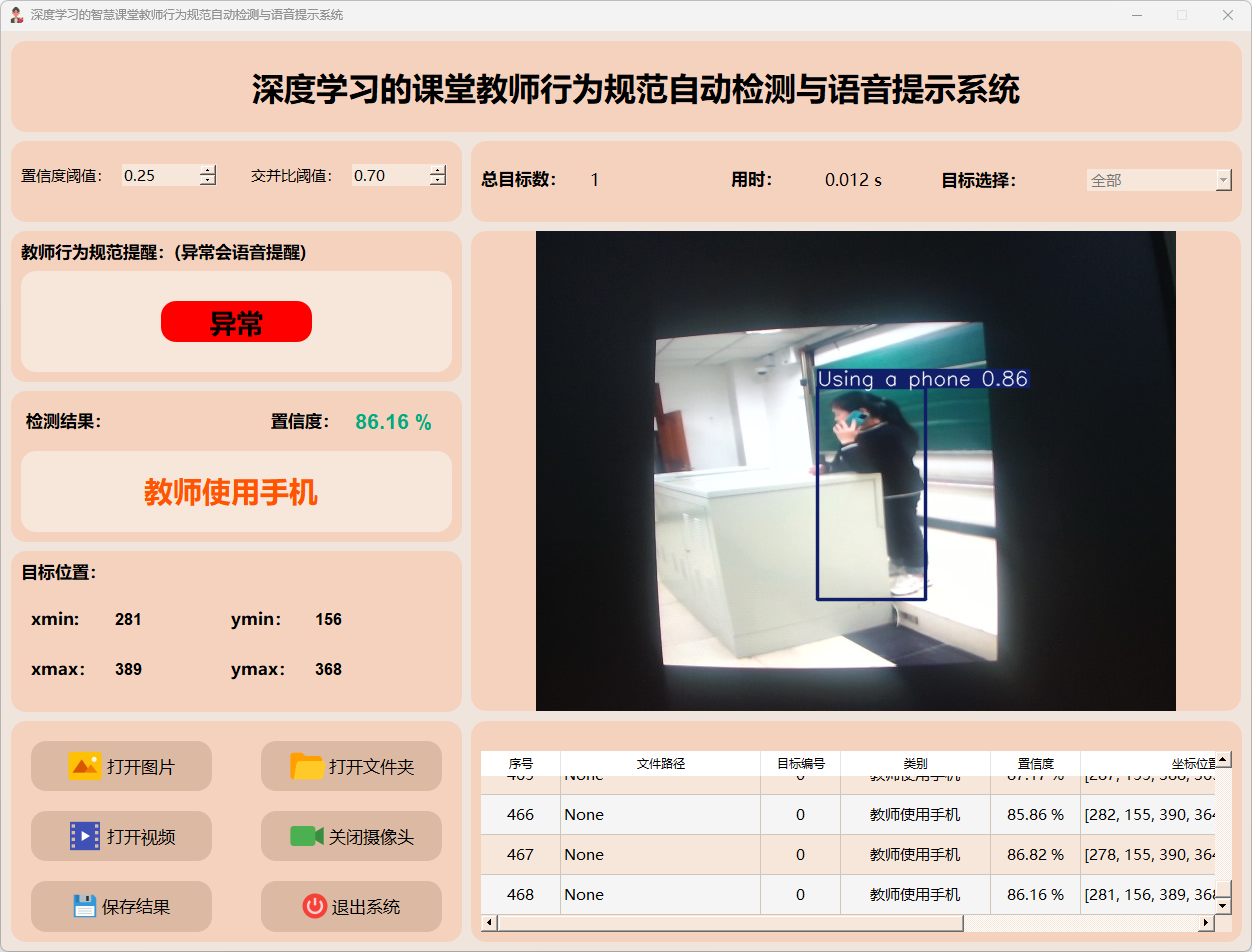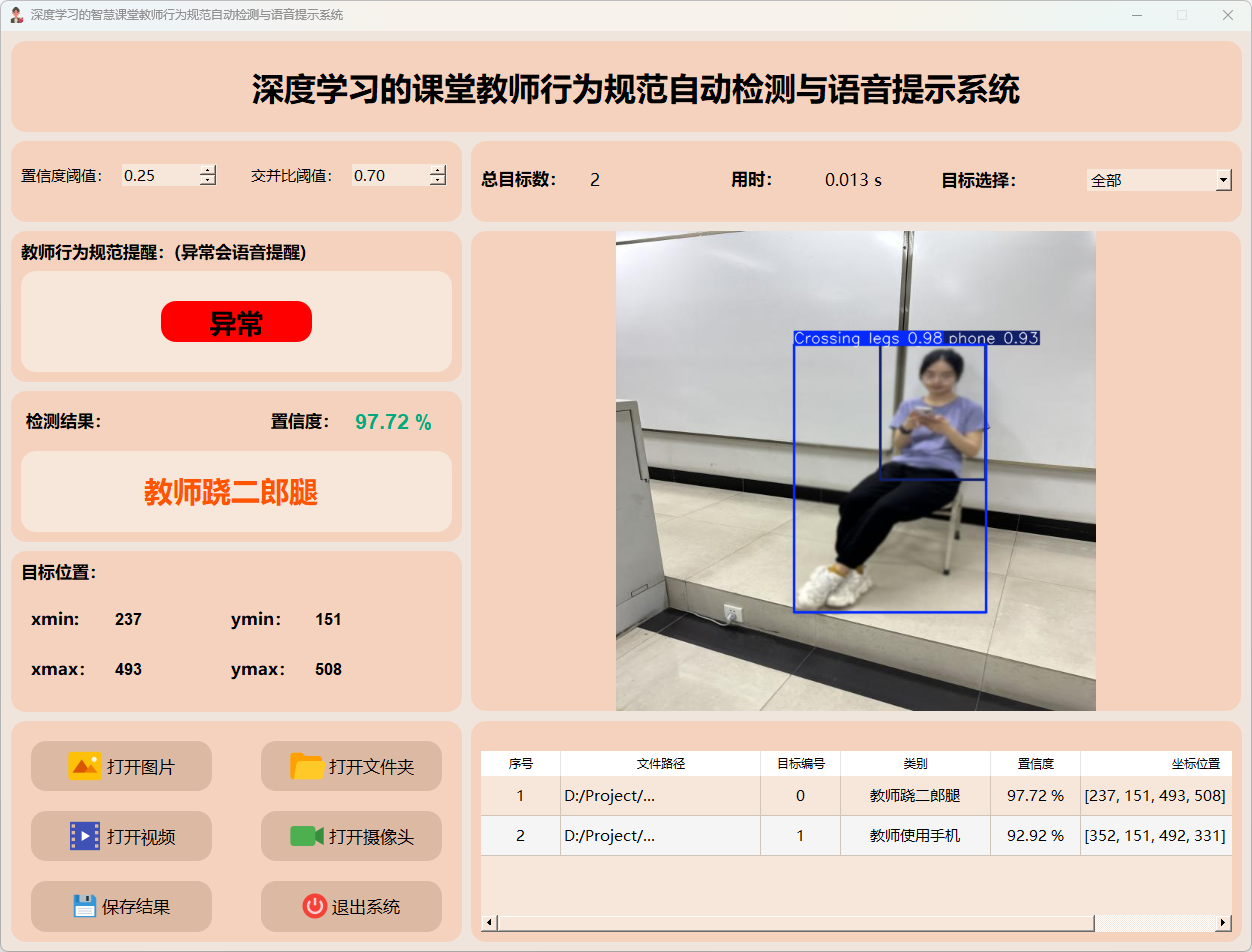 检测结果:系统接入摄像头持续监控教师行为,并实时反馈检测结果。动态展示摄像头的画面,并标定行为位置于图像中;同时记录每一帧的详细监测数据于表格中。