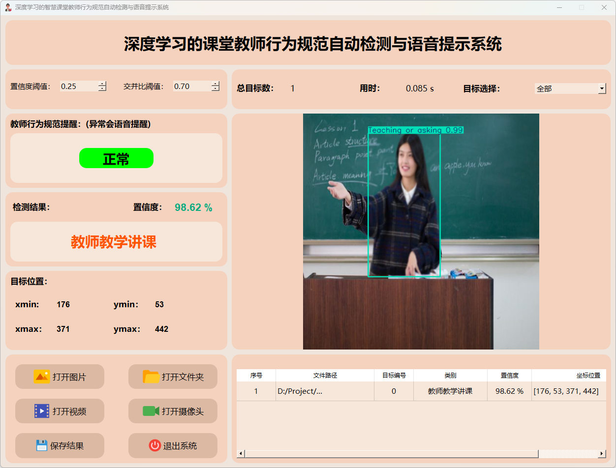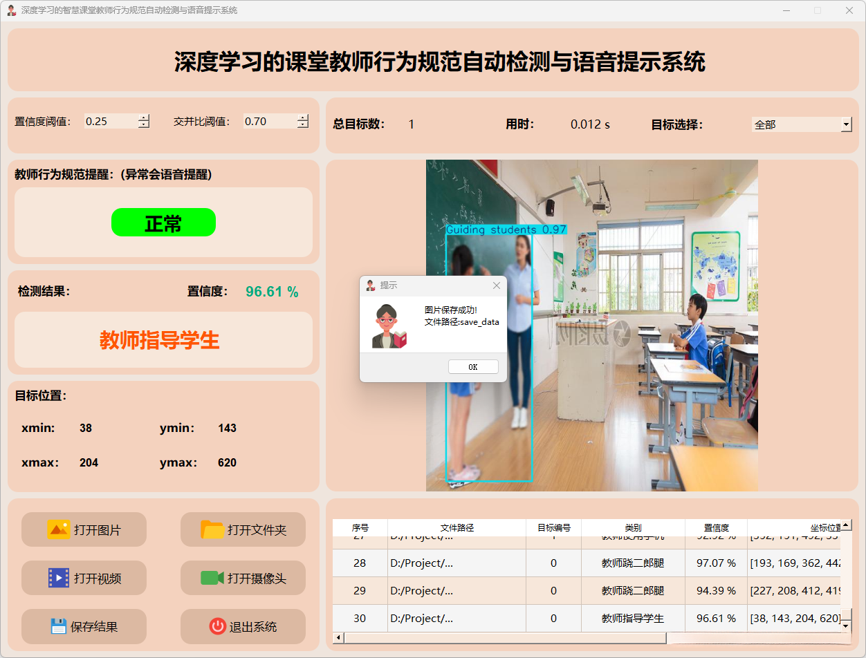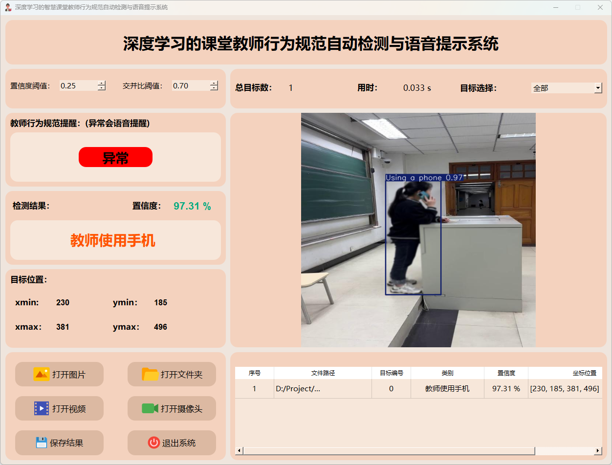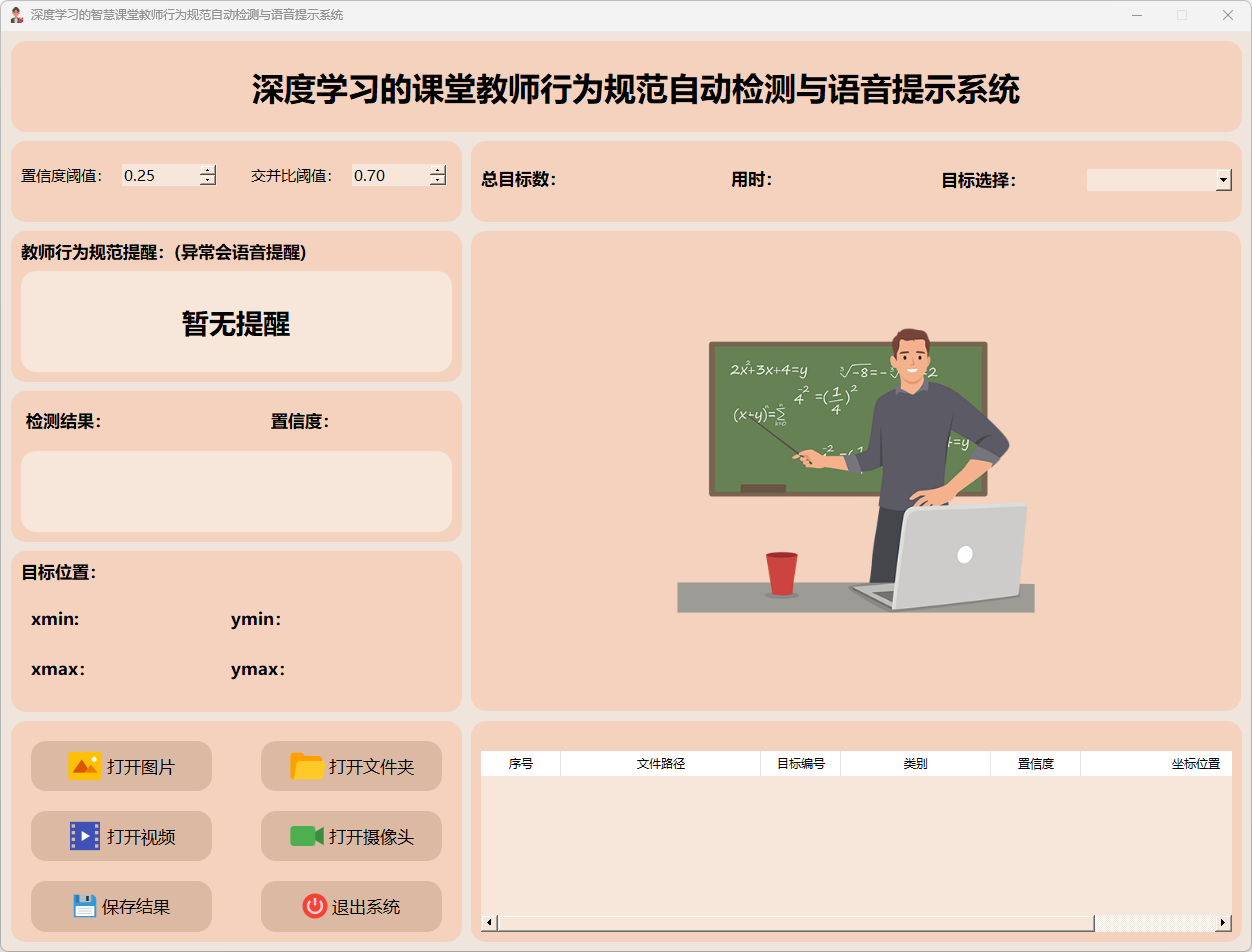 检测结果:系统接入摄像头持续监控教师行为,并实时反馈检测结果。动态展示摄像头的画面,并标定行为位置于图像中;同时记录每一帧的详细监测数据于表格中。