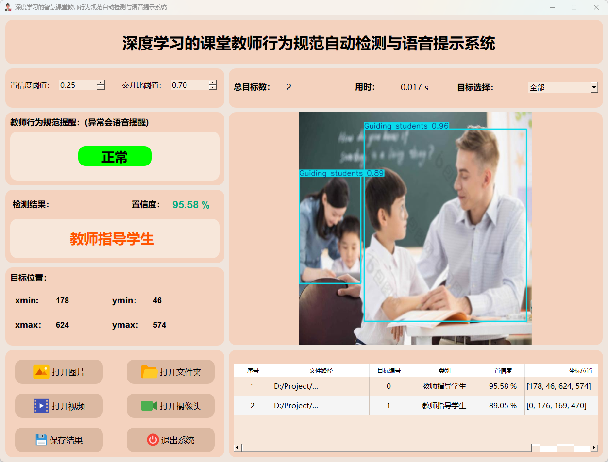 检测结果:系统识别并显示教师行为的分析报告,并涵盖总目标数、用时、目标类型、置信度以及目标的位置坐标信息。