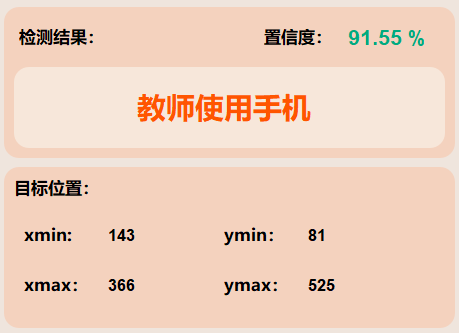 (1)该模型对检测到的目标被归类为"教师使用手机"类别具有91.55%的置信度。