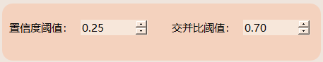 (2)交并比阈值:当前设置为0.70,表示系统只会认为交并比(IoU)超过70%的检测框为有效结果。交并比是检测框与真实框重叠区域的比值,用于衡量两个框的相似程度,值越高表明重叠程度越高。