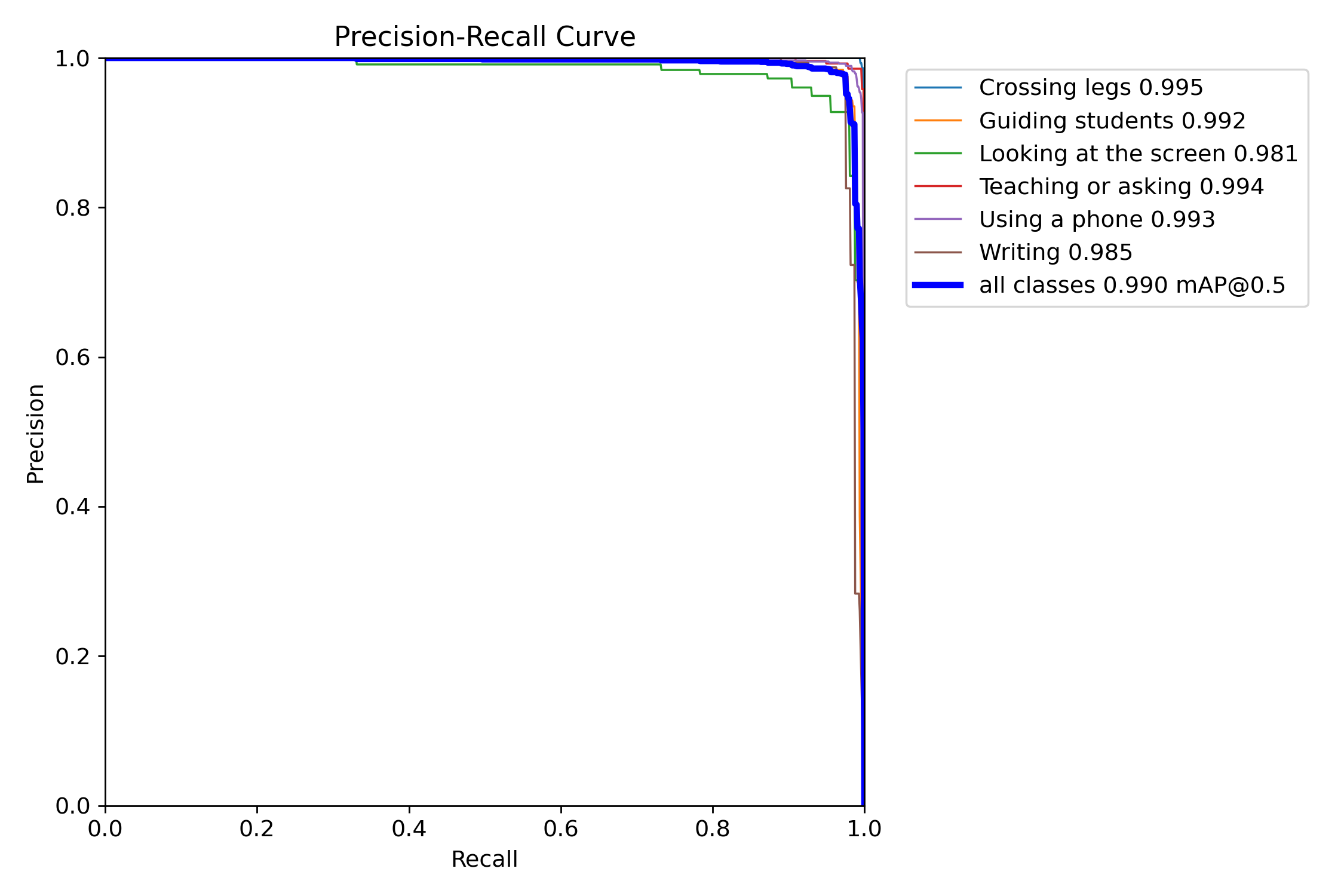 紫色(Using a phone – 使用手机): 此分类的精确率为 0.993,在其召回率为 0.973 时略微低于 'Teaching or asking' 类别;但整体上仍保持较高的水平