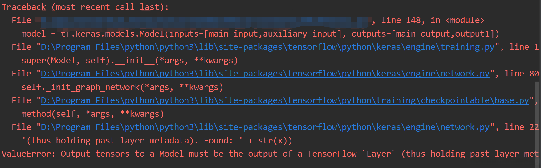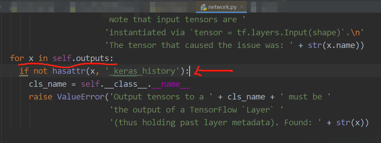 识别出该代码行中的变量x不具备'_keras_history'属性,并因此推断变量main_output也未具备该属性。经过查阅资料发现原因在于在编程过程中插入了一条不带有'_keras_history'属性的方法。进一步分析发现这一现象源于所使用的后端框架是TensorFlow而非Keras