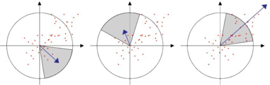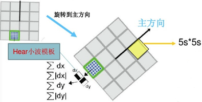 SIFT算法中的关键point方向分配机制主要通过计算每个关键point周围区域的梯度分布来进行确定。与SIFT不同,在SURF算法中通常会计算每个关键point周围圆形区域内的HARR小波变换特性。对于每个关键point周围的圆形区域,在60度范围内分别计算水平和垂直方向的小波系数总和。随后将扇区以固定角度间隔旋转,并重新计算该区域内各角度下的HARR小波系数值。最终选取具有最大HARR小波系数总和的那个扇区的方向作为该关键point的主要方向向量