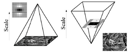 与SIFT相比,SURF构建金字塔图像存在显著区别,SURF基于Hessian矩阵行列式的近似值来生成特征图。