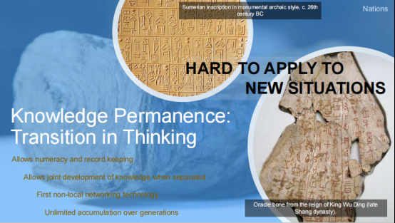 书写系统的发展如何使得知识得以保存和传承。苏美尔楔形文字和商朝甲骨文是早期书写系统的例子,它们使得知识可以被记录并在几代人之间保持不变。这种持久性的知识积累为人类思考增加了物理技术,但也面临着难以适应新情况的挑战。
