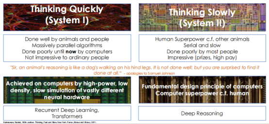 系统II的慢速思考则是人类相对于其他动物的一种超级能力。计算机在快速思考方面表现不佳,但可以通过高功率、低密度的硬件模拟实现慢速思考。引用塞缪尔·约翰逊的话,说明动物的推理能力虽然不如人类,但仍然令人惊讶。