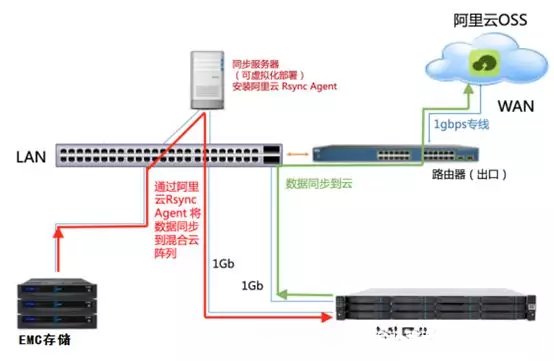 在这里,我们采用了阿里云的另一个替代产品——复合型云存储网关(Cloud Storage Gateway),该系统能够实现IDC存储新增数据的即时同步至云端OSS平台,并确保增量数据的实时传输。