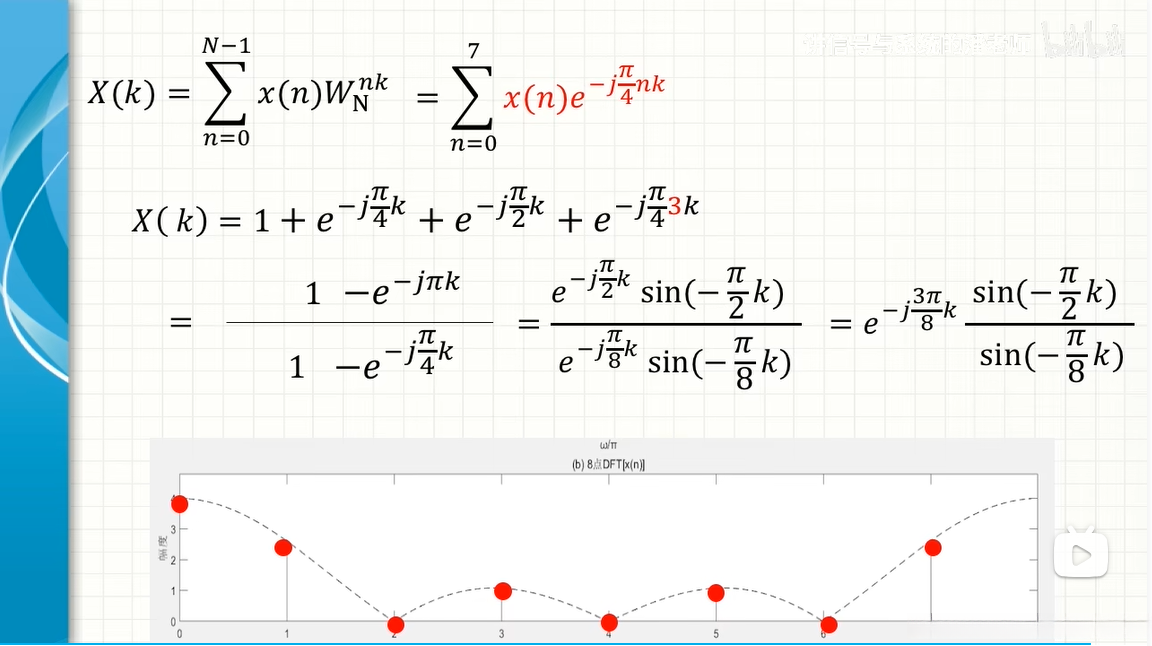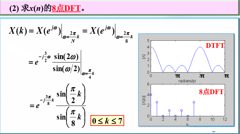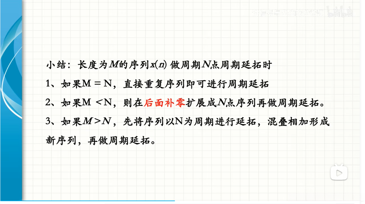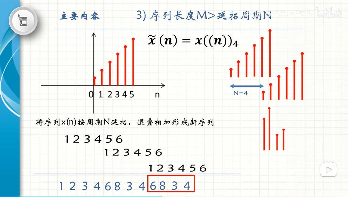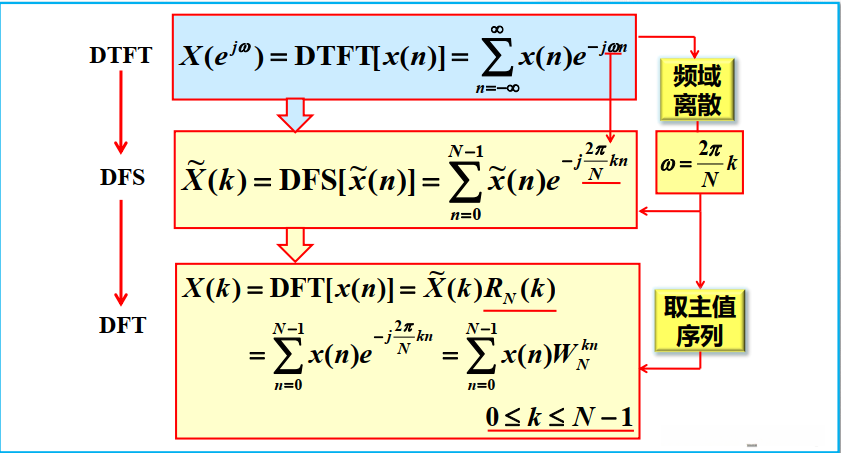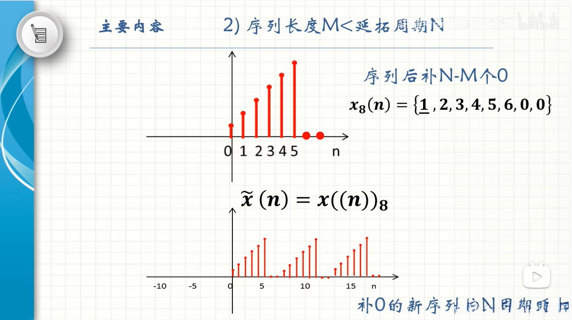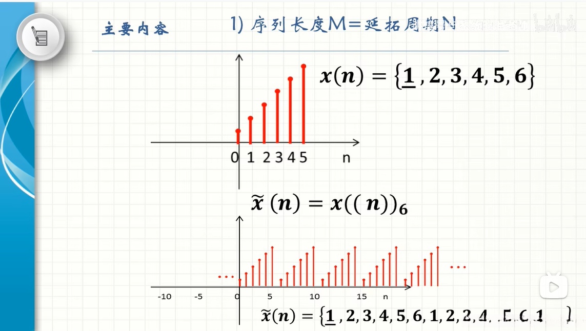 基于第一个周期(0 \leq n \leq N-1)中的DFS对就得到了对应的DFT对。换句话说,在针对DFT的研究中所关注的定义范围中**x(n)被限定为0 \leq n \leq N-1区间内的取值,在频域表示为X(k)**则同样限定在0 \leq k \leq N-1范围内。然而,在DFT讨论的实际操作中,默认将有限长度序列视为周期序列的一个周期片段来进行处理。具体来说,则是先假设序列值被周期延拓后再进行相应的运算处理,并最终截取主值序列作为结果输出。