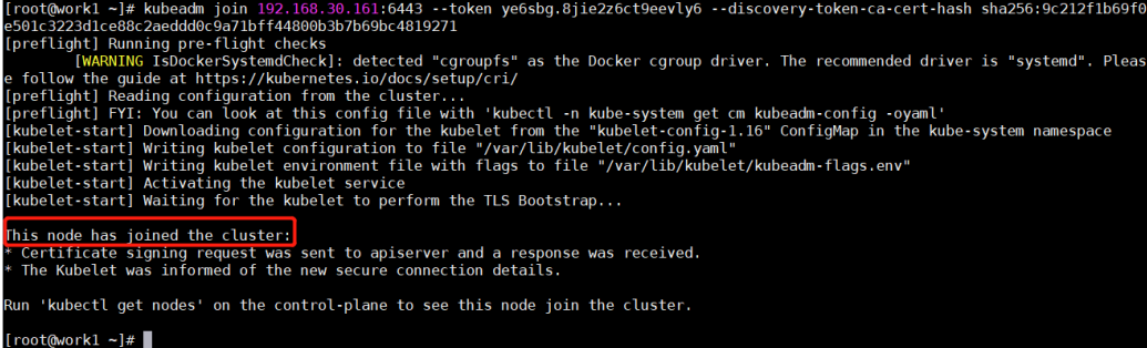 命令:kubeadm join 192.168.30.161:6443 --token k1pe7l.tqze8jxrltk9elds --discovery-token-ca-cert-hash sha256:865e1169ec58773850b496678c1b3ab252683b014ef899e68ccf4ac826528412