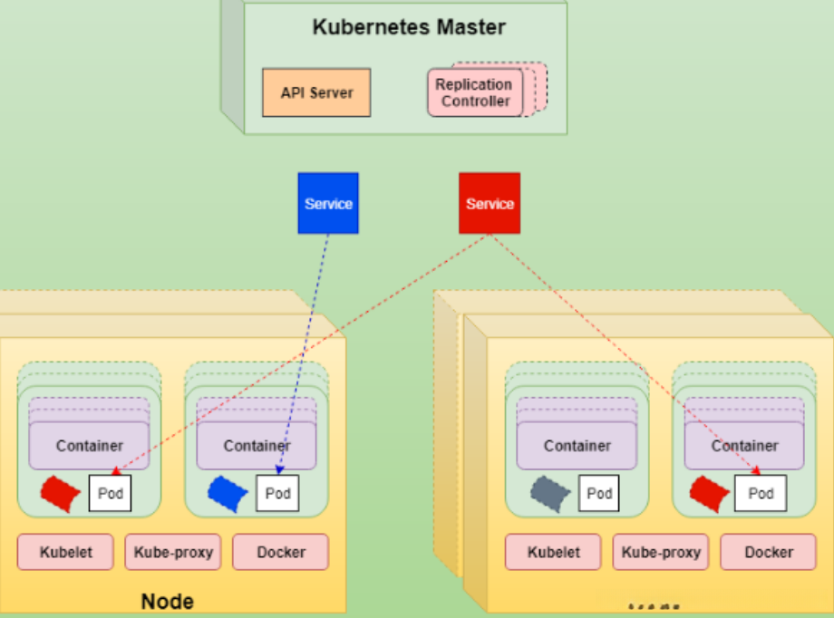 The Kubernetes cluster comprises node-level Kubelet agents and master components (such as APIs, schedulers, and other services), and the architecture diagram of Kubernetes services follows.