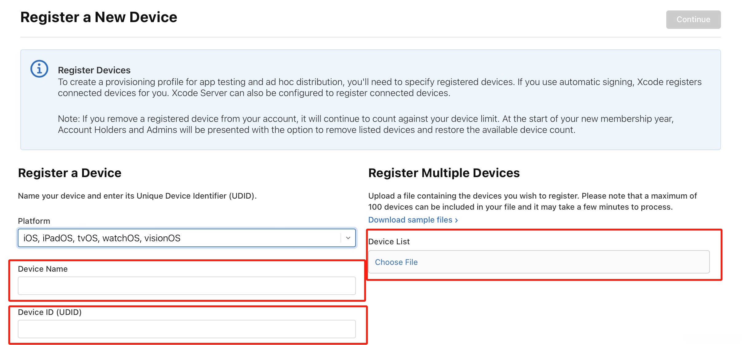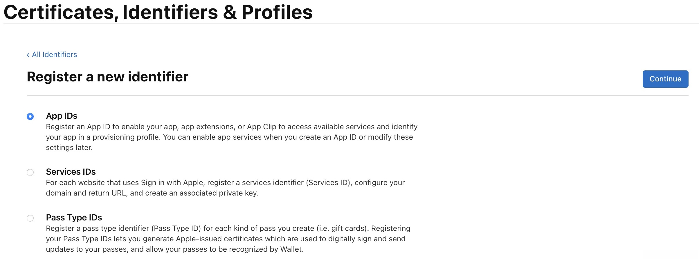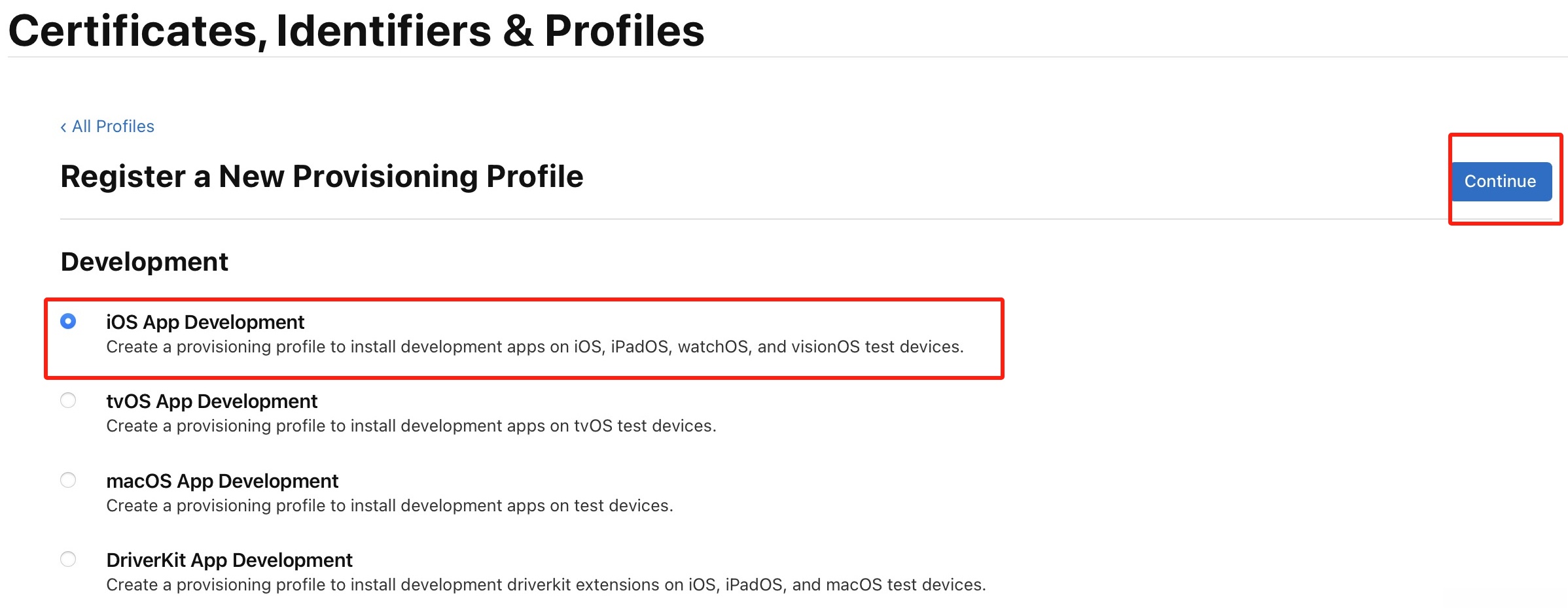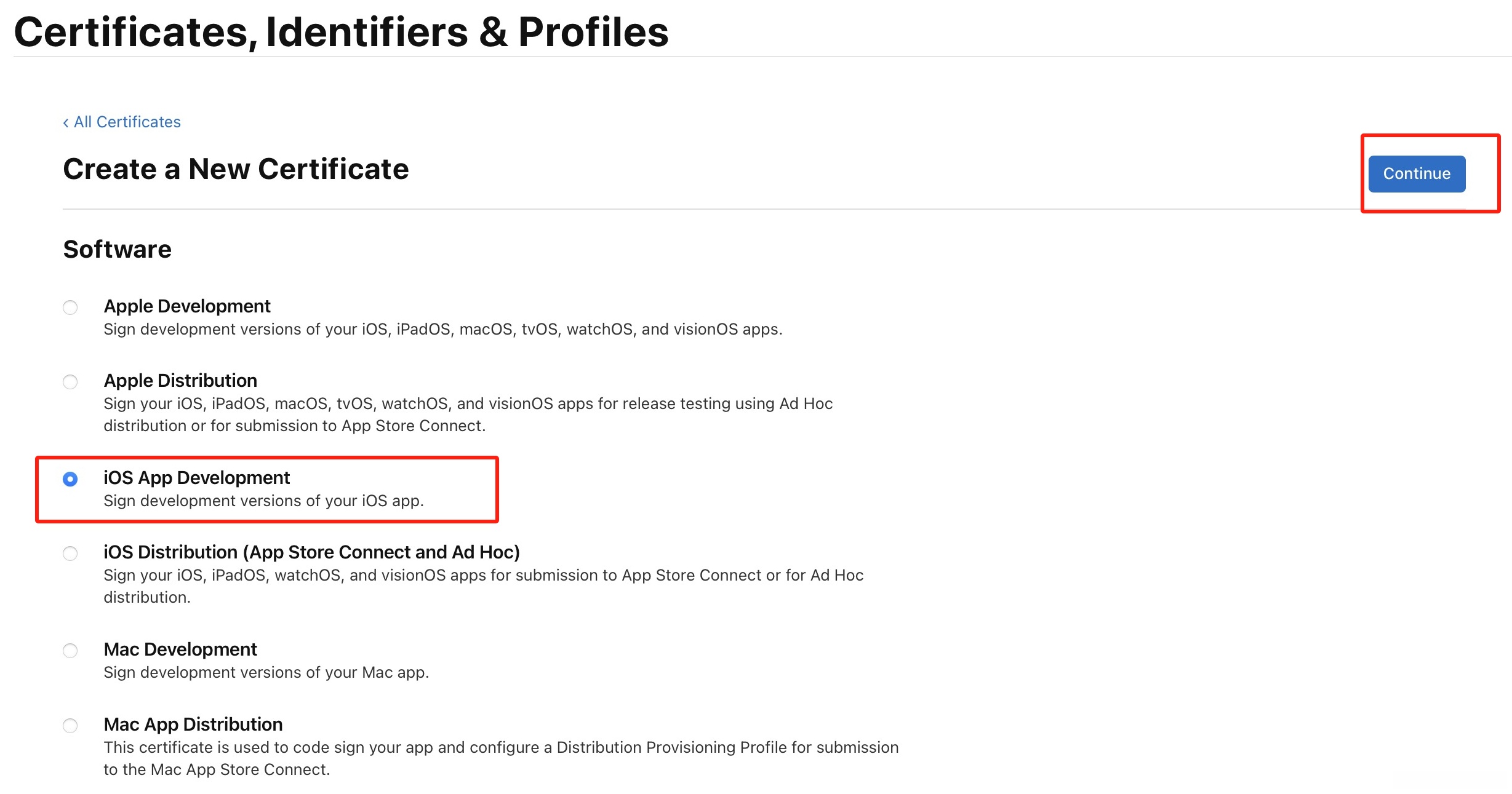 b、发布版证书,配置为 iOS 分布式(包括App Store Connect和Ad Hoc选项)--> Continue