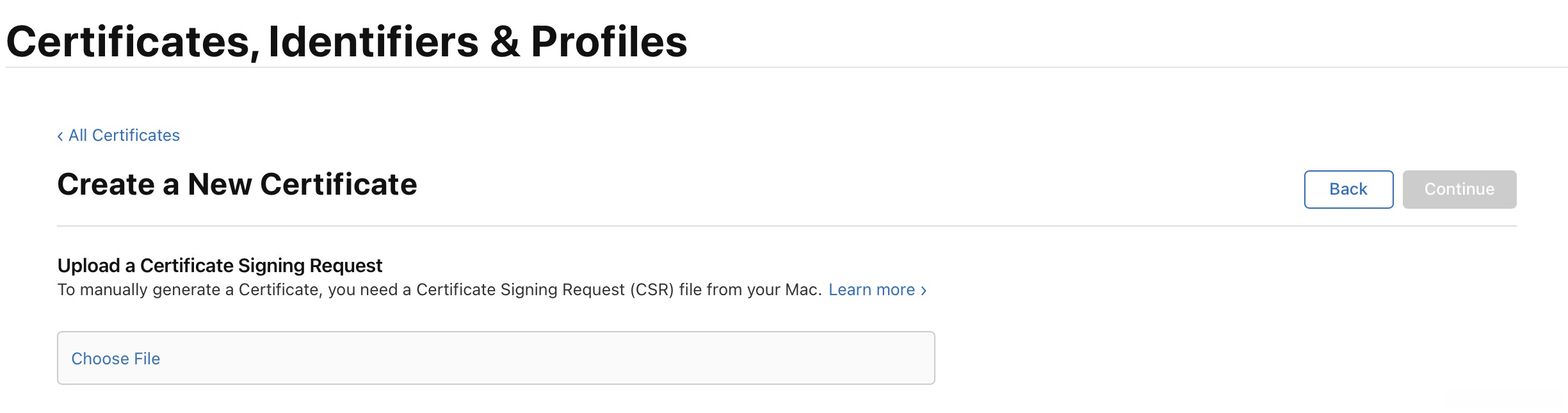 c、Choose File --> 点击 刚刚从钥匙串访问那里获取了 证书请求文档 --> Continue