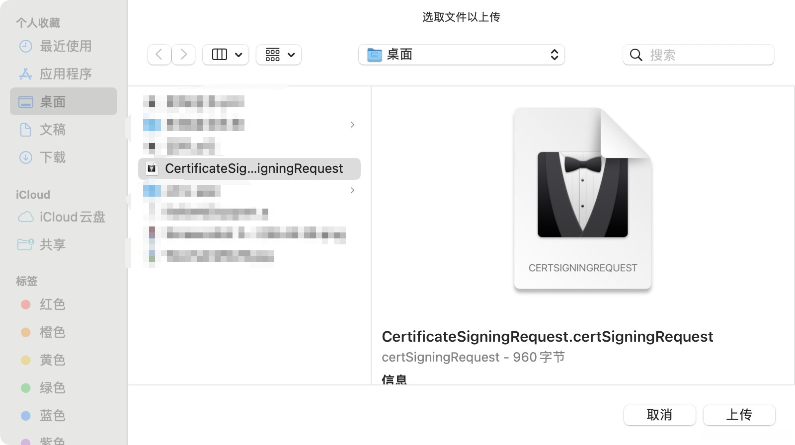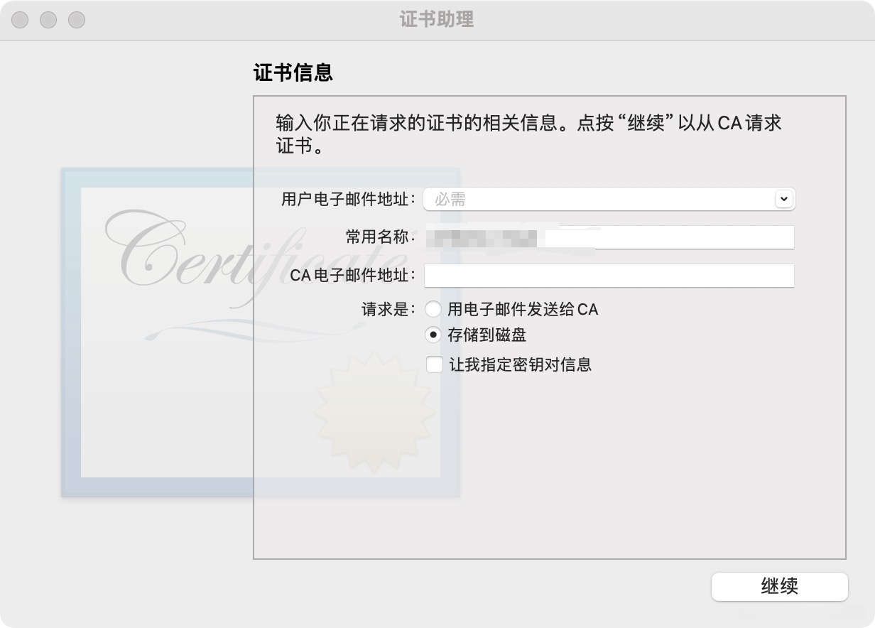 c、单击继续后,名称无需修改(.certSigningRequest),建议将文件保存在一个易于找到的位置,推荐存放在桌面。