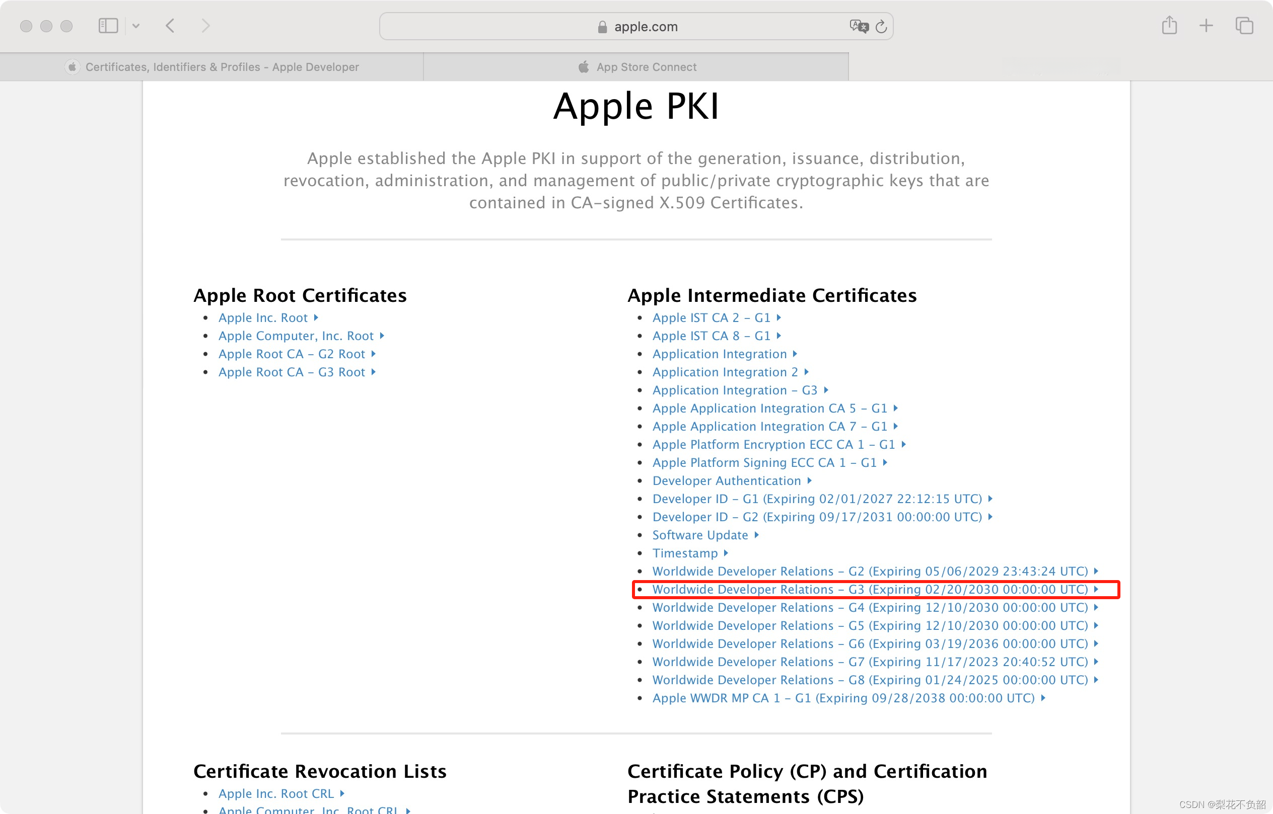 若遇到证书无效的情况,则需要重新获取开发证书,访问Apple PKI - Apple网站,找到对应的证书信息,进行下载操作。