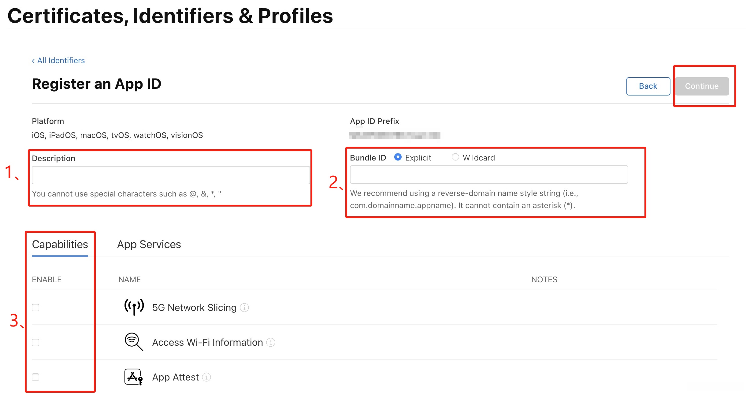 为了给一个app申请一个支持测试和发布使用的BundlelD,因此需要明确指定一个App ID,并选择Explicit选项。