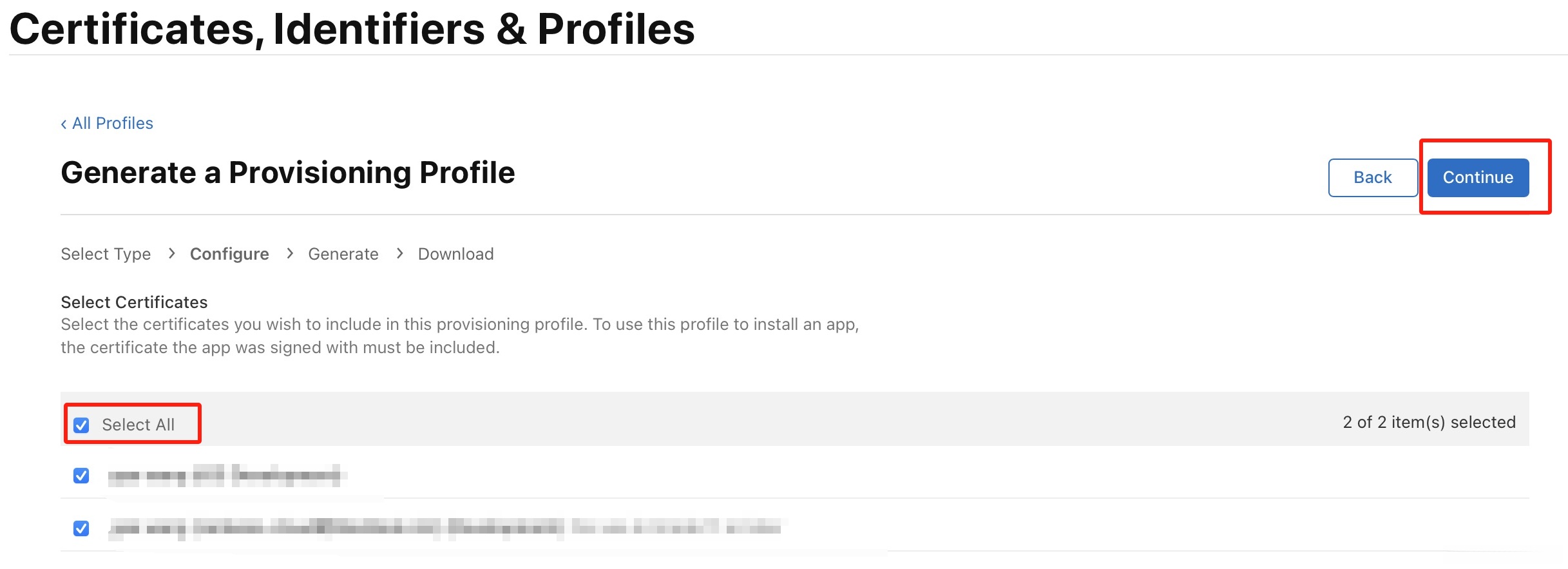 d、选择需要绑定的证书,建议全选 Select All --> Continue