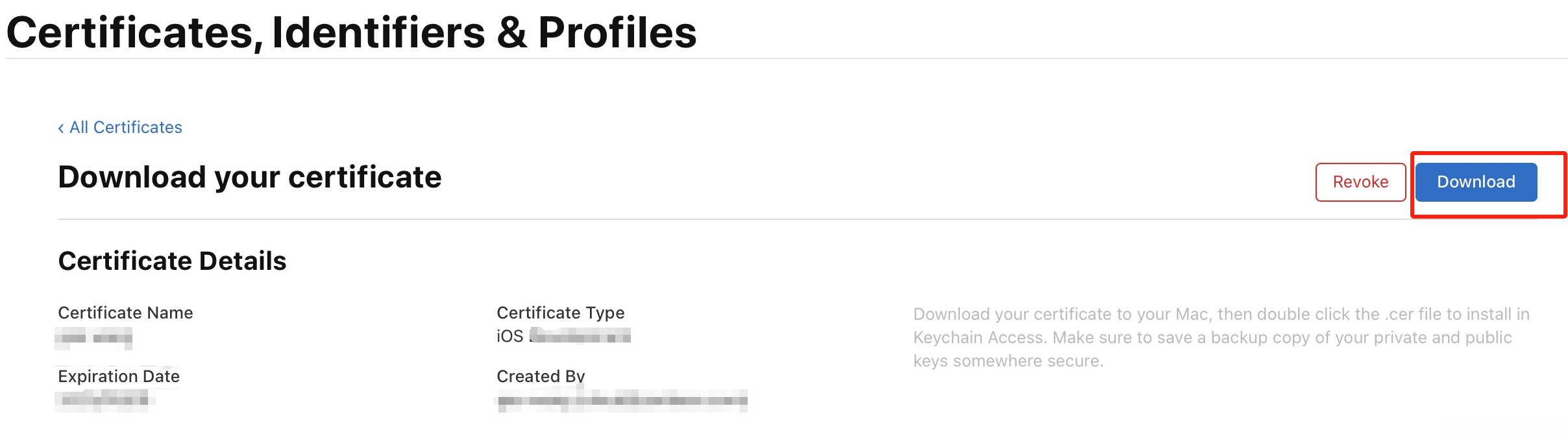 d、证书申请完成 --> Download,将证书下到本地 (ios_production.cer)