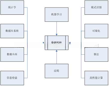 该领域以应用为导向,并整合了众多的技术分支,包括统计学、机器学习、模式识别等基础学科以及数据库系统与数据仓库技术等前沿领域。这些核心技术体系不仅涵盖了信息检索与处理方法,并且结合了可视化展示手段与高性能计算支持,在多个相关领域的核心技术上取得了显著进展。如图所示