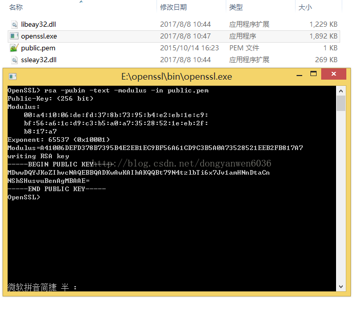 使用openssl工具对私钥进行解析,并运行rsa命令以获取公钥模数。请确保public.pem文件与OpenSSL.exe处于同一目录中。