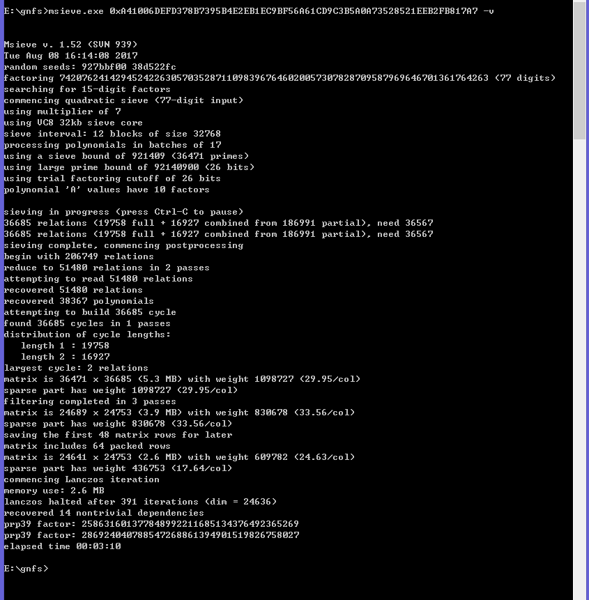 E:\gnfs>msieve.exe 0xA41006DEFD378B7395B4E2EB1EC9BF56A61CD9C3B5A0A73528521EEB2FB817A7 -q