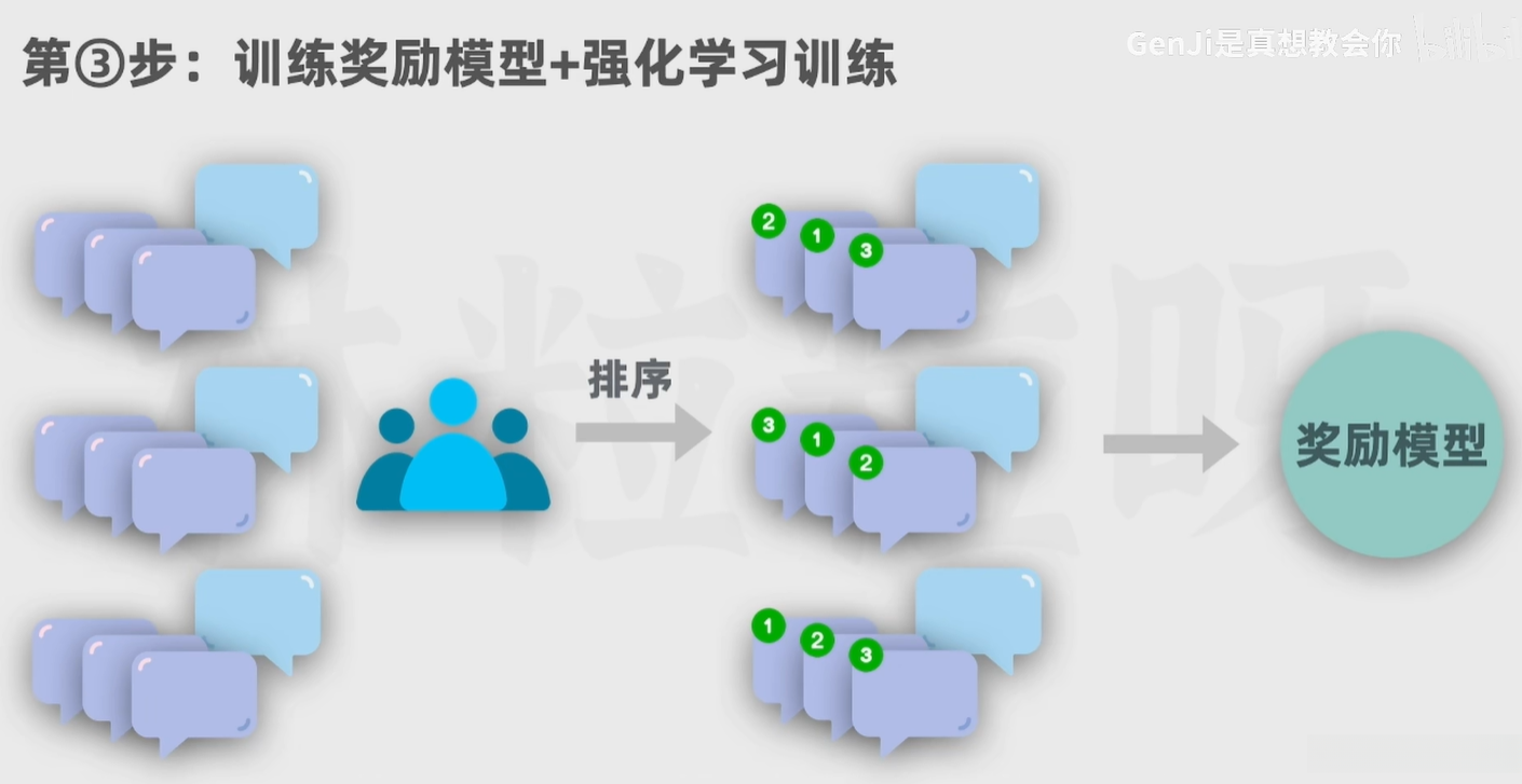 3、用问题和多个对应回答的数据,让人类标注员对回答进行质量排序,基于这些数据,训练出一个能对回答进行评分预测的奖励模型。