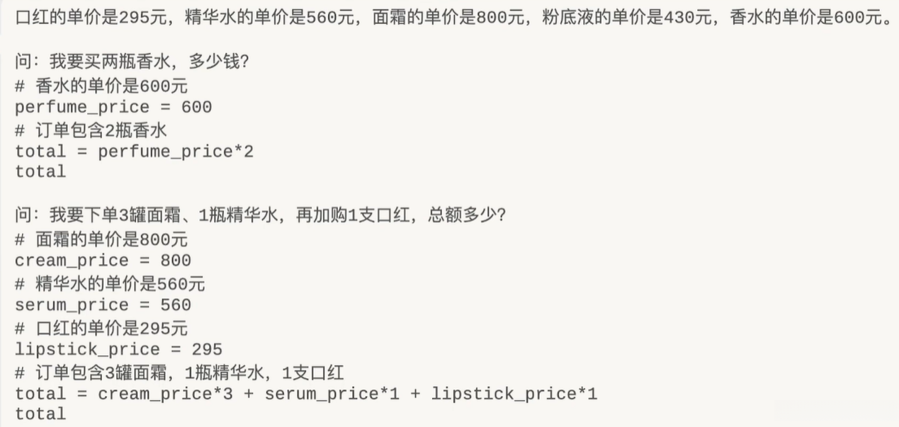 此时,我们给AI的要求就是,在设计计算步骤时,生成得到计算结果所需的代码+思维链,在小样本提示中,写出解决问题所需的变量赋值、数学运算等代码,让模型照猫画虎。