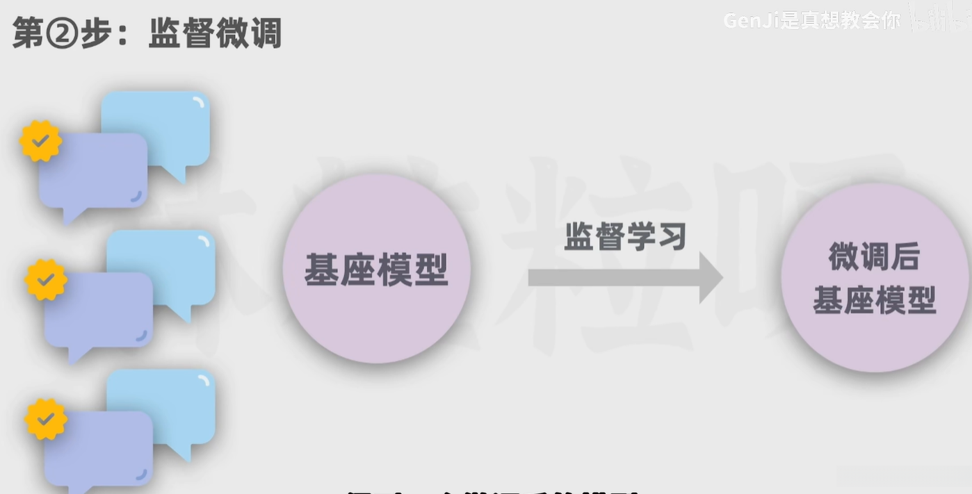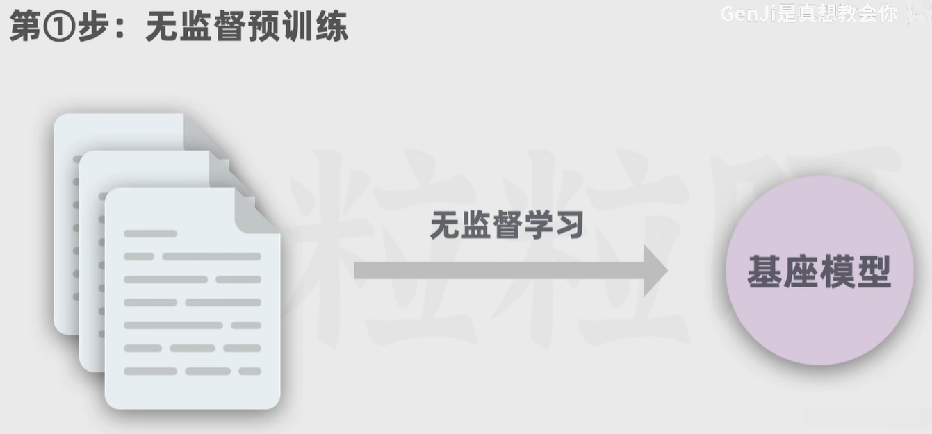 1、通过大量文本,进行无监督学习 预训练,得到一个能进行文本生成的基座模型 ;