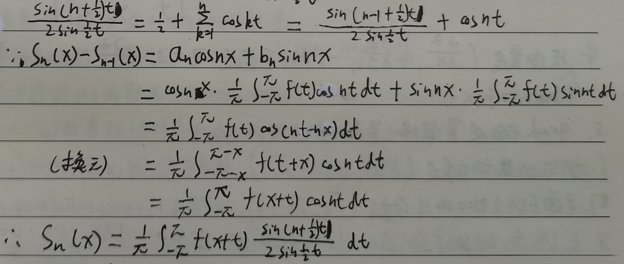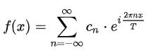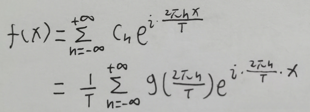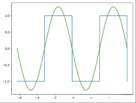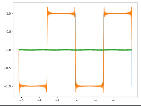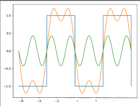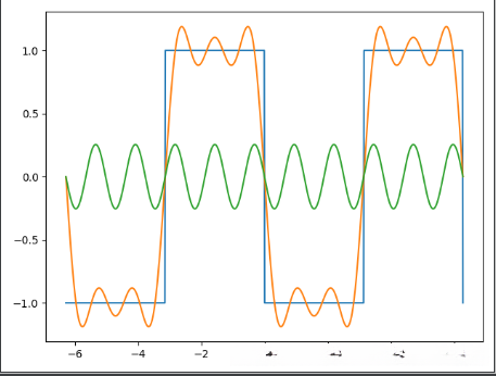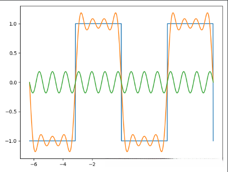 蓝色的是原始函数,绿色的是傅里叶级数的第n项,橙色的是傅里叶级数的前n项和。