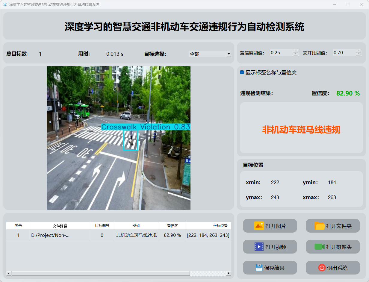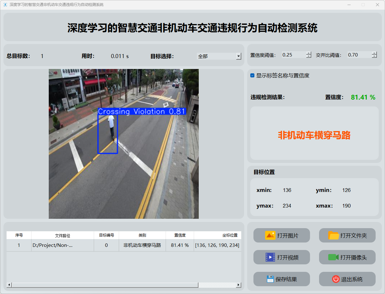 本研究开发了一款基于YOLOv8深度学习模型的智慧交通非机动车违规行为自动检测系统。该系统旨在利用实时视频流自动识别并分类非机动车人的违规动作,并涵盖"非机动车横穿马路"以及"非机动车斑马线违规"两大类别。该系统结合PyQt5框架进行人机交互界面的设计与实现,并从而实现了用户操作简便、便于即时查看检测结果的功能。系统的核心技术模块主要负责通过YOLOv8模型实现目标物体的精准识别。通过精确识别非机动车人的各种违规动作特征,并实现了对交通违法行为的即时监测与预警机制