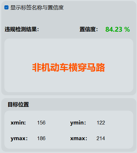 (1)这表明该模型识别出的物体类别中包含非机动车横穿马路这一项的分类信心值为84.23%。
