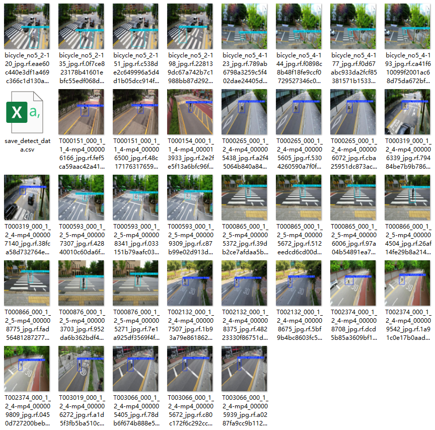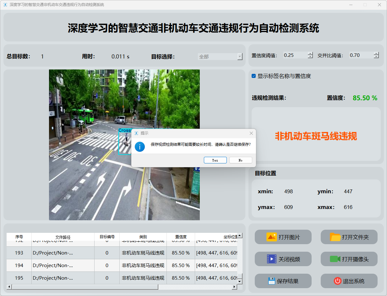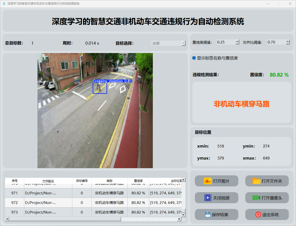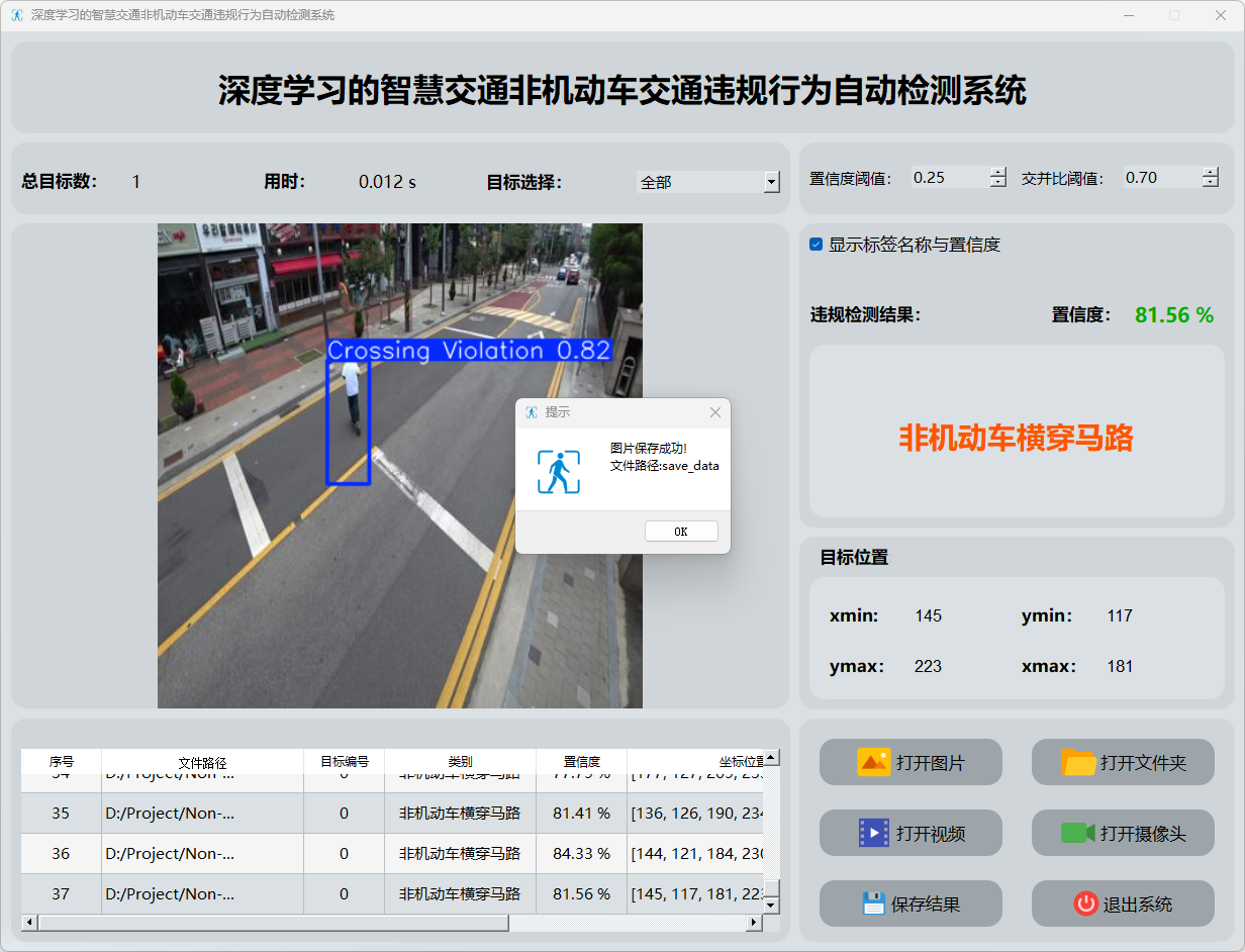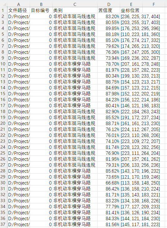 监测数据显示:该系统能够实时监控视频流,并能识别出非机动车越行越过的图像片段,并将这些关键数据反馈给操作人员。通过表格形式展示了各次检测事件的发生置信度及具体位置坐标