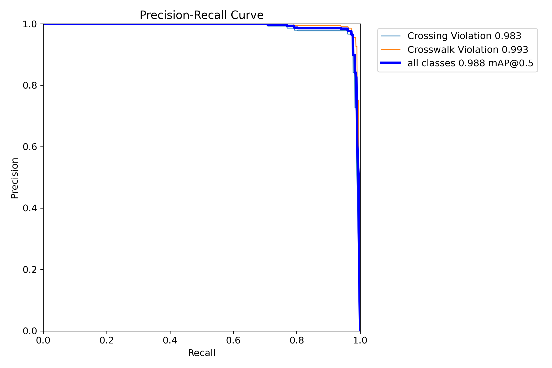 在Precision-Recall曲线上用蓝色标记的是"非机动车横穿马路"违规行为,在橙色线条上则标注的是"非机动车斑马线违规"的情况。以粗线形式展示的是各类别检测性能的整体表现。该模型在非机动车横穿马路及斑马线违规这两类场景中均展现了较高的精确率与召回率。