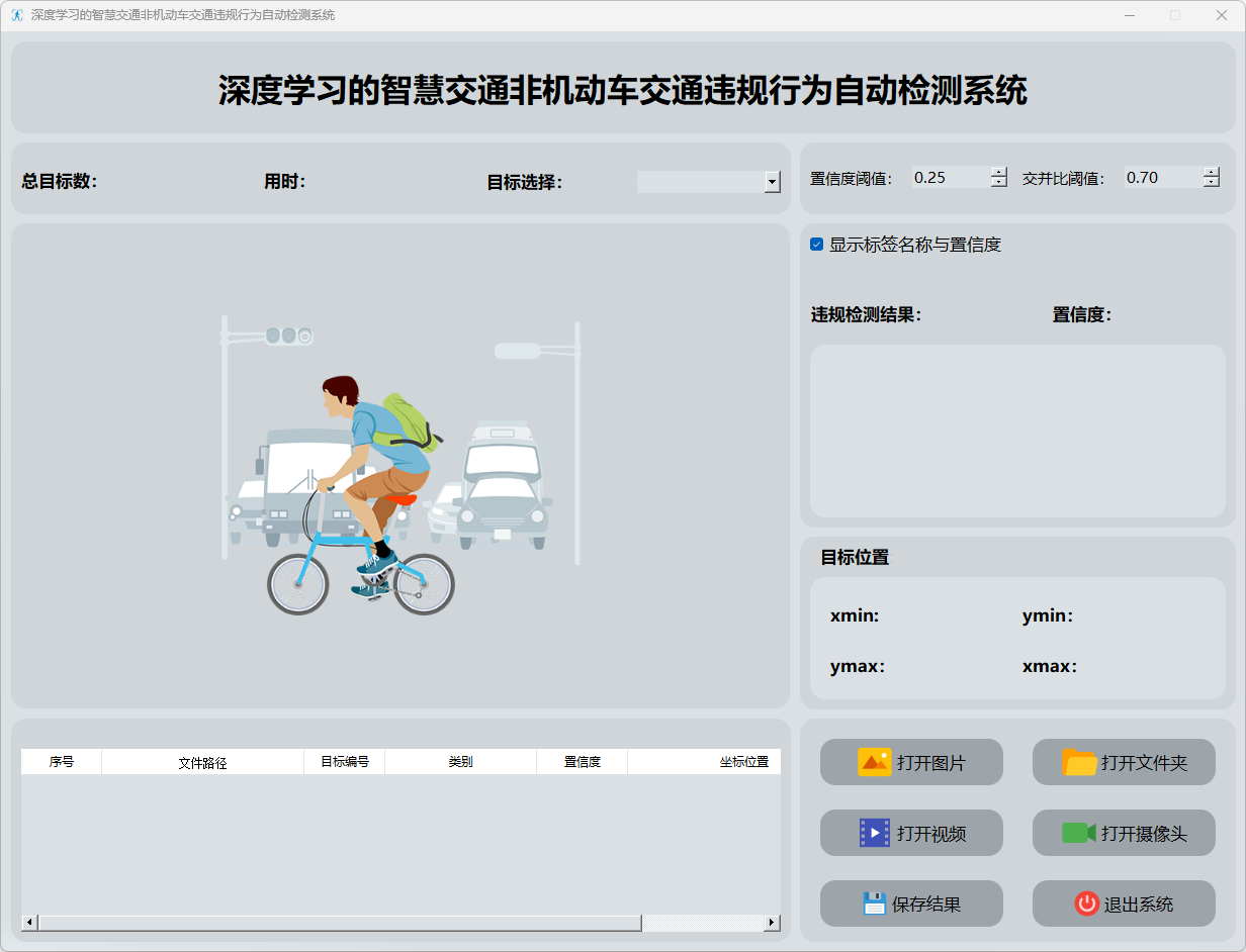 主要功能:该系统具备以下核心功能特点:(1)能进行在线处理目标图片中的非机动车交通违规图像检测;(2)能够实现多种数据源的接入与整合,并支持批量处理能力;(3)界面能够动态呈现目标定位结果、目标数量统计以及相应的置信度和用时信息;(4)系统能够存储相应的检测结果。