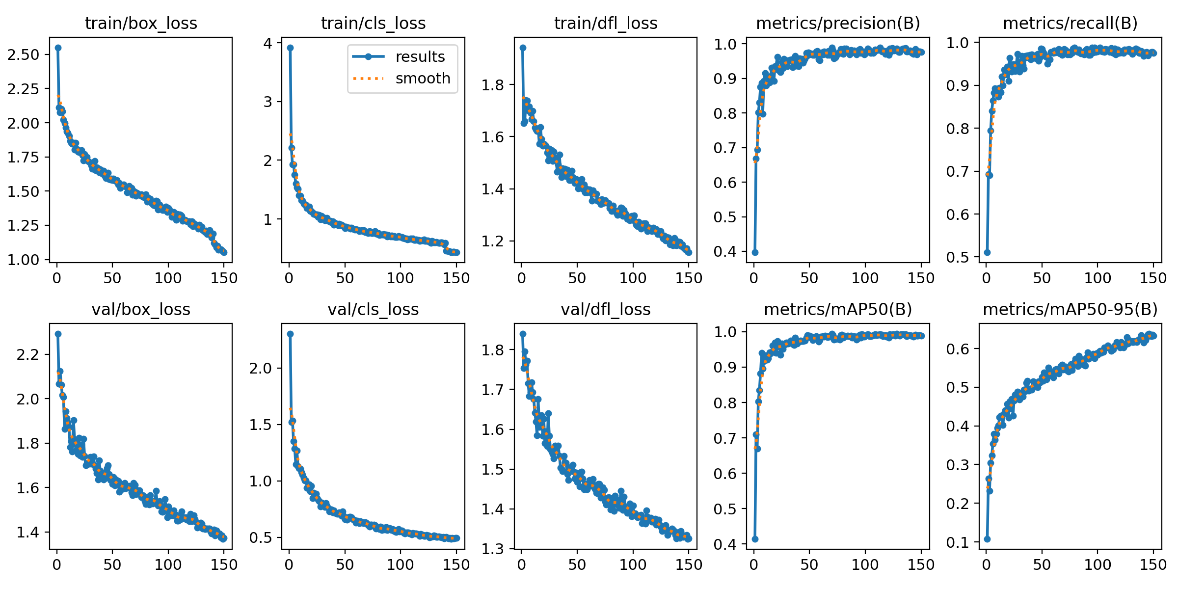该损失函数train/dfl_loss体现了Distribution Focal Loss的变化趋势,并被应用于边界框分布精度的优化。随着训练过程的发展,此损失函数逐渐减小。这表明模型在深度特征学习过程中表现出色。