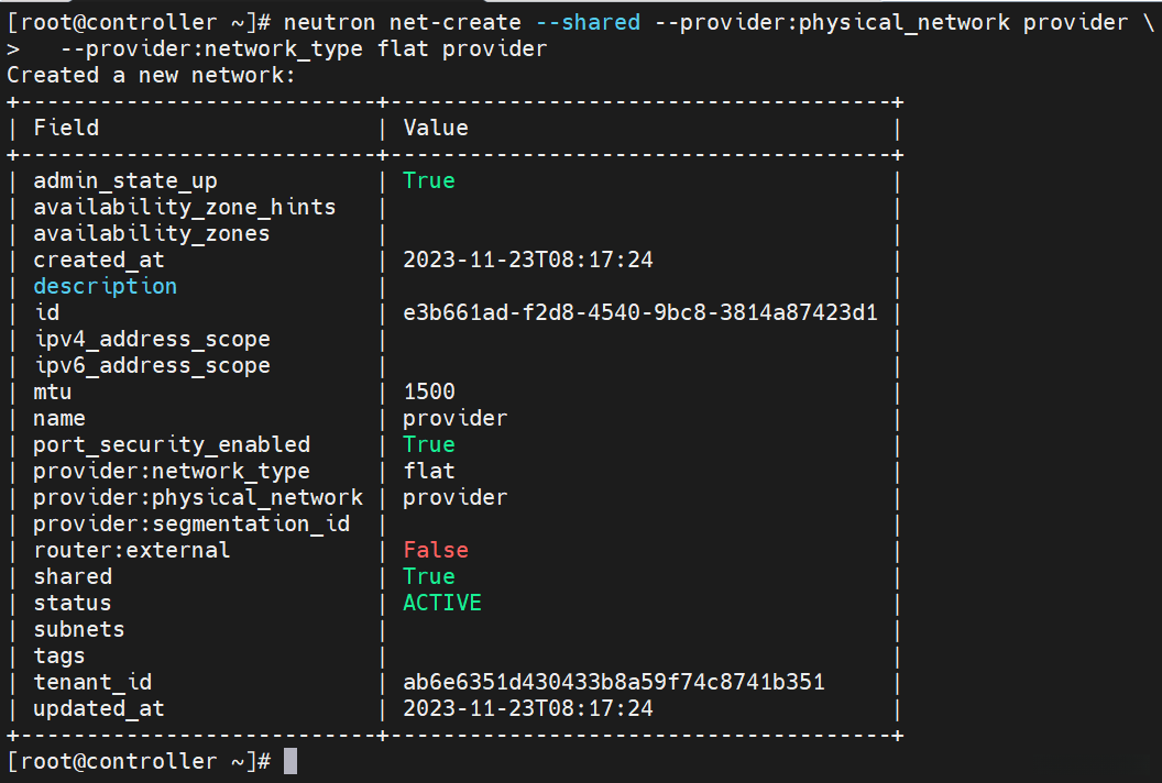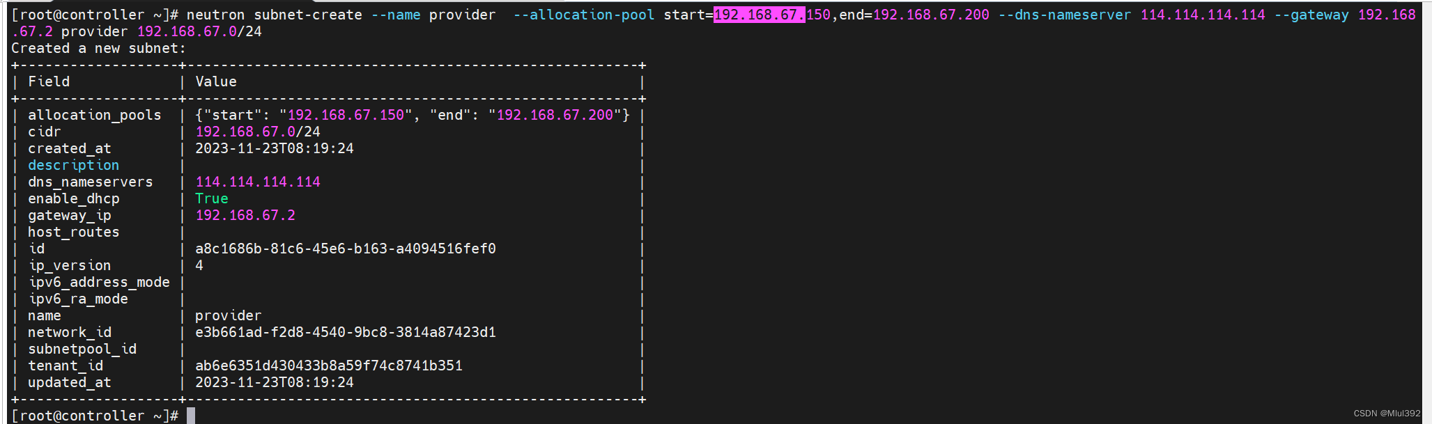 neutron subnet-create --name provider --allocation-pool start=192.168.67.150,end=192.168.67.200 --dns-nameserver 114.114.114.114 --gateway 192.168.67.2 provider 192.168.67.0/24