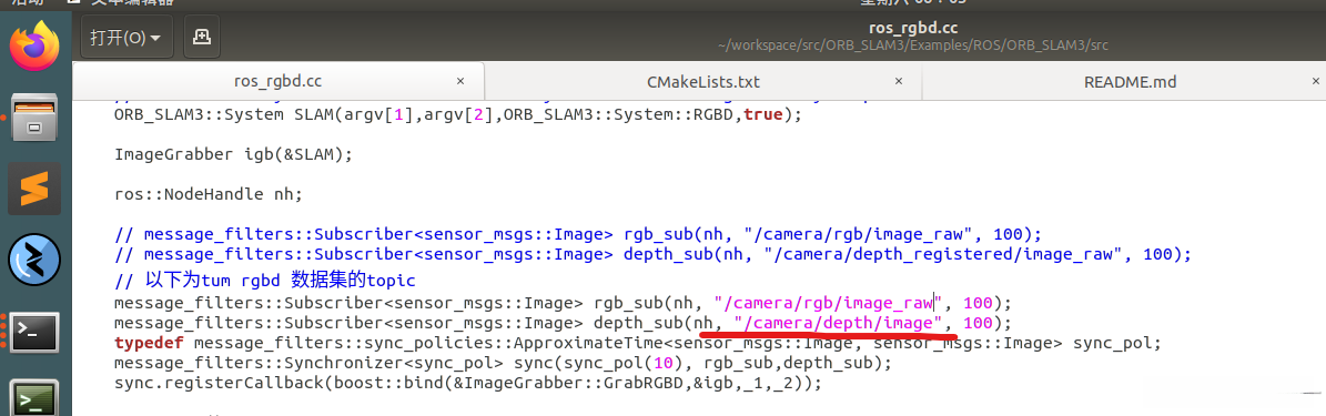 修改/home/wheeltec-client/workspace/src/ORB_SLAM3/Examples/ROS/ORB_SLAM3/src/ros_rgbd.cc,