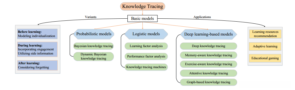 目前基本的KT模型分为三类进行分类和回顾:(1)在学习前建模个性化,(2)在学习过程中结合参与和利用辅助信息,(3)在学习后考虑遗忘。