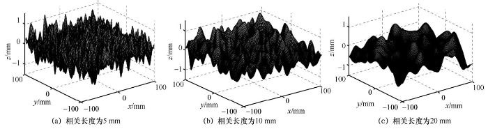 其中Nx和Ny分别代表x轴和y轴方向上的等间隔离散点数量。从 图2 和 图3 的展示可以看到, 均方根高度分别为0.1毫米、0.5毫米, 相关距离设定为5毫米、10毫米及20毫米时, 对粗糙表面的模拟结果进行对比分析。通过比较 图2 和 图3 中的结果, 可以观察到均方根高度决定了粗糙面起伏的高度差, 而相关长度则决定了粗糙面波动的频率特征。对于光滑表面的情况, σh趋近于零值, l趋向于无限大值。