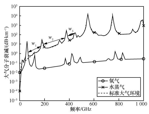 大气分子吸收衰减由于大气分子对电磁波能量的吸收而引起。一部分被激发的大气分子以特定频率振动,并与电磁波发生共振的同时部分电子发生能级跃迁其能量转换为其动能 [28]. 该频段的大气吸收衰减主要受氧气和水蒸气的影响此外还受到温度 气压以及海拔高度等因素的影响. ITU-R P.676-11建议书 [29]提出了大气吸收衰减模型其适用范围最高可至1 THz. 大气分子吸收衰减的吸收损耗(单位为dB/km)可表示为