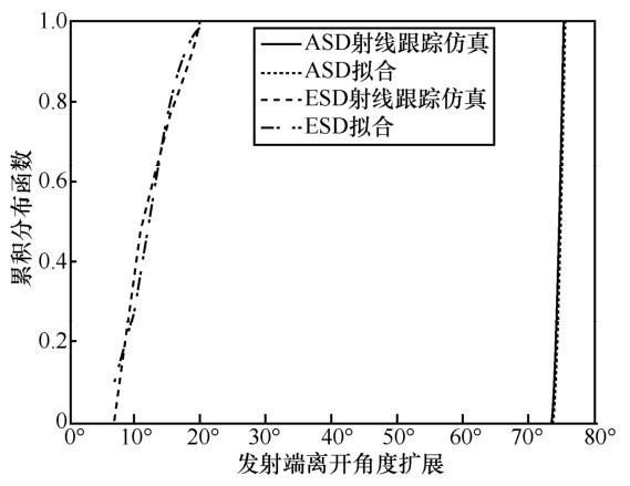 定义角度扩展为Tx和Rx在三维空间中各条多径的到达与离开方向的空间分布。其中每条多径在其发射端具有离开方向,在接收端具有到达方向;这两个方向分别位于水平面上形成水平方位角,在垂直面上形成仰角。因此角度扩展包含四个关键参数:即发射端的角度变化范围(ASD, azimuth angular spread of departure)、接收端的角度变化范围(ESD, elevation angular spread of departure)、发射端的角度变化范围(ASA, azimuth angular spread of arrival)以及接收端的角度变化范围(ESA, elevation angular spread of arrival)。其计算公式如上所示为(46)